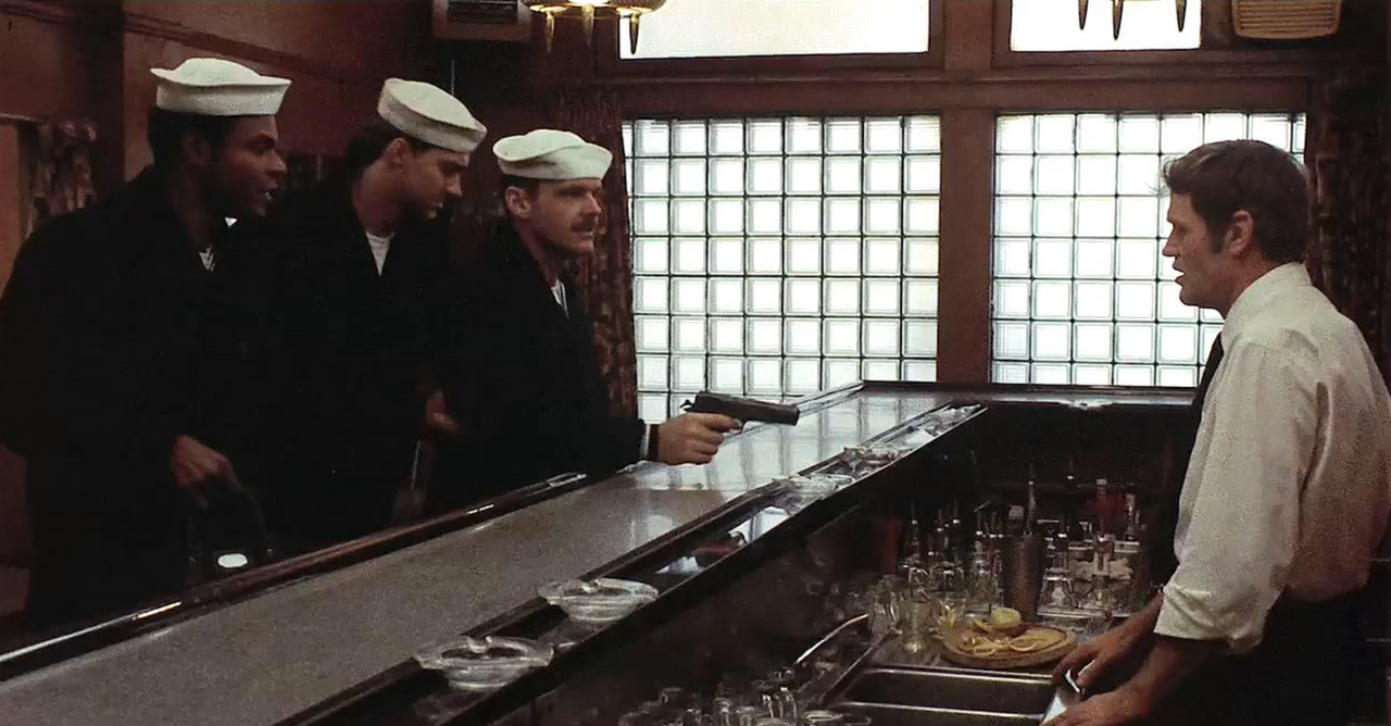 When the latter picks a fight with a group of Marines (referred to throughout the film as bullies) in a train station, the entire episode comes off as gleeful and innocent. The consequences of being a “blowhard” here are a sense of accomplishment and camaraderie, of having given Meadows (who partakes in the brawl) a lesson in “sticking it to the man.” This is the case too when Buddusky pulls the service pistol on the bartender. Excitement—not powerlessness—is the dramatic thrust of both scenes.