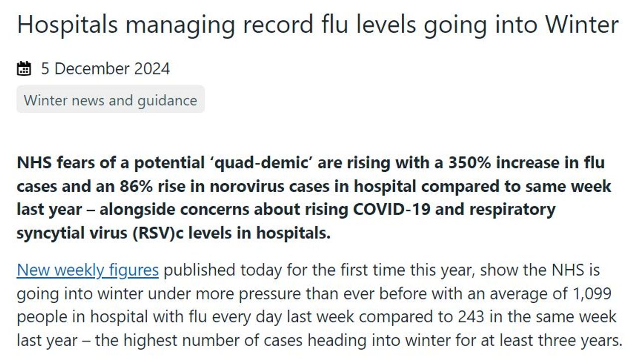 On December 5, National Health Service England issued a statement headlined, “Hospitals managing record flu levels going into Winter”, warning, “NHS fears of a potential ‘quad-demic’ are rising with a 350% increase in flu cases and an 86% rise in norovirus cases in hospital compared to same week last year—alongside concerns about rising COVID-19 and respiratory syncytial virus (RSV)c levels in hospitals.”